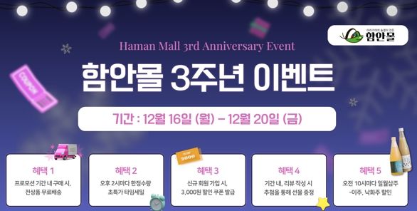 [경남도민뉴스=이상민 기자] 함안군농업기술센터에서 운영 중인 군 직영 온라인 쇼핑몰 ‘함안몰'에서는 개장 3주년을 기념해 오는 16일부터 20일까지 5일간 다양한 혜택을 담은 이벤트를 실시한다.