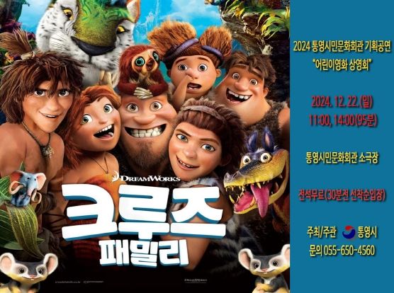 [경남도민뉴스=김부경 기자] 통영시는 어린이를 위한 영화 '크루즈 패밀리'를 오는 22일 오전 11시, 오후 2시에 통영시민문화회관 소극장에서 무료 상영한다고 밝혔다.