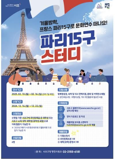 ‘2025 파리15구스터디’ 모집 대상은 서초구에 주민등록을 둔 대학생 또는 서초구 소재 대학에 다니는 학생으로, 12월 22일까지 지원 서류를 작성해 담당자 이메일로 제출하면 된다. 경비는 파리15구에서 전액 지원한다.