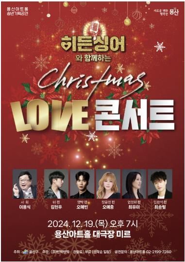[경남도민뉴스=김완호 기자] 서울 용산구가 오는 19일 오후 7시 용산아트홀 대극장 미르에서 송년 기획공연으로 히든싱어와 함께하는 ‘크리스마스 LOVE 콘서트’를 개최한다.