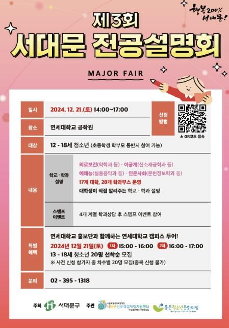 관내 청소년과 학부모 등 300여 명이 참여할 수 있으며 희망자는 서대문진로직업체험지원센터 홈페이지(커뮤니티→공지사항)를 통하거나 해당 홍보 포스터의 QR코드로 접속해 신청할 수 있다.