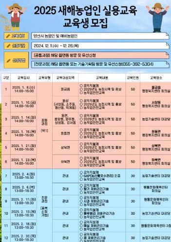 [경남도민뉴스=최미정 기자] 양산시농업기술센터는 농업인들의 새해 영농설계를 돕기 위해 ‘2025년 새해농업인실용교육’을 내년 1월 8일부터 2월 20일까지 진행한다고 밝혔다.