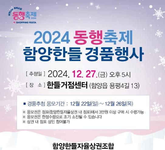 [경남도민뉴스=장광동 기자] 2024 동행축제의 일환으로 함양한들 경품행사 및 상권 이벤트가 오는 12월27일 오후 5시부터 함양한들거점센터에서 열린다.