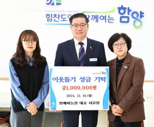 이날 밤깨비농장 서윤임 대표가 함양군청을 방문해 이웃돕기 성금 100만원을 기탁하며, “앞으로도 꾸준히 나눔 활동에 기여하고 싶다”고 밝혔다.