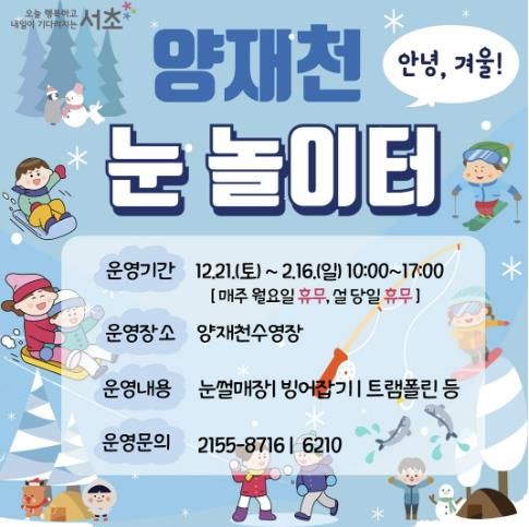 서울 서초구는 겨울방학을 맞아 내년 2월까지 양재천수영장(양재동 126-1)에 ‘겨울눈놀이터’를 운영한다고 밝혔다.