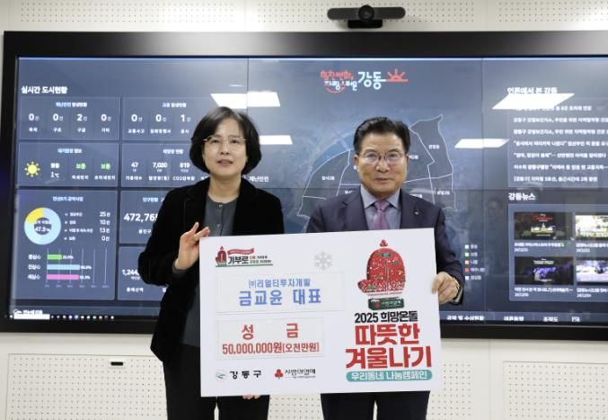 [경남도민뉴스=김완호 기자] 강동구는 지난 17일, ㈜리얼티투자개발 금교윤 대표가 취약계층을 위한 따뜻한 겨울나기 성금 5,000만 원을 기부했다고 19일 밝혔다.