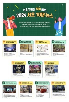 ‘2024 서초 10대 뉴스’ 온라인 투표 결과 1위는 ‘서초 계절별‧테마별 축제’가 선정됐다. 서초구를 대표하는 고품격 음악축제로 자리잡은 ‘2024 서리풀페스티벌’은 지난 9월28일~29일 '서초 is the Music A-Z(음악의 모든 것)'을 주제로 20만명의 시민들에게 다채로운 볼거리와 즐길거리를 선사하며 10차선 반포대로를 뜨겁게 달궜다. 또, 지난 4월 방배뒷벌어린이공원에서 열린 ‘봄밤의 클래식 축제’, 6월 고속터미널 광장에서 열린 ‘서초뮤직앤아트페스티벌’ 등 계절별‧테마별 축제를 구 전역에서 지속적으로 개최해 주민들에게 사계절 수준 높은 음악선물을 선사하고 문화예술도시로서의 위상을 한 단계 높였다는 점에서 가장 많은 표를 얻었다.