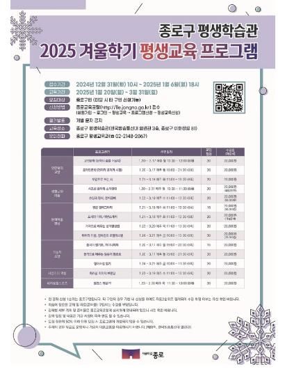 [경남도민뉴스=김완호 기자] 종로구가 이달 31일부터 2025년 1월 6일 18시까지 '2025년 겨울학기 평생교육 프로그램' 수강 신청을 접수한다.