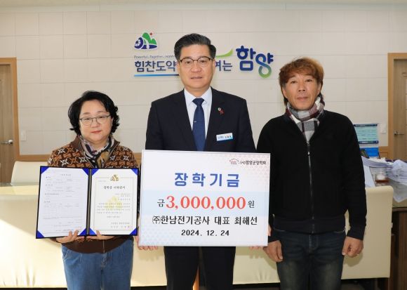 ㈜한남전기공사의 최해선 대표는 성탄절을 앞두고 지역민과 온정을 나누기 위해 24일 함양군을 방문하여 장학금 300만 원을 기탁했다. 최 대표는 “우리 군을 이끌어갈 미래 인재들을 지원하게 되어 뜻깊게 생각하며, 지역 학생들이 함양군장학회의 지원을 받아 지역을 이끌어갈 훌륭한 인재로 성장하기를 바란다”고 말했다.