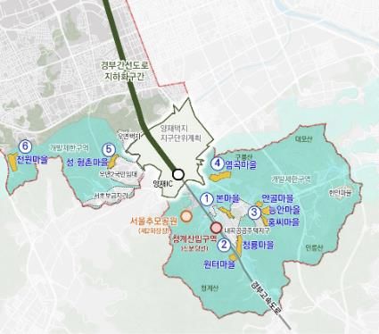 이번 용도지역 상향의 대상이 된 10개 마을은 서초구 본마을, 청룡마을, 원터마을, 홍씨마을, 능안마을, 안골마을, 염곡마을, 성촌마을, 형촌마을, 전원마을이다. 1970년대 취락구조개선사업으로 형성된 중·대규모 집단취락으로, 2002년과 2006년에 국토교통부로부터 개발제한구역에서 해제된 지역이다.