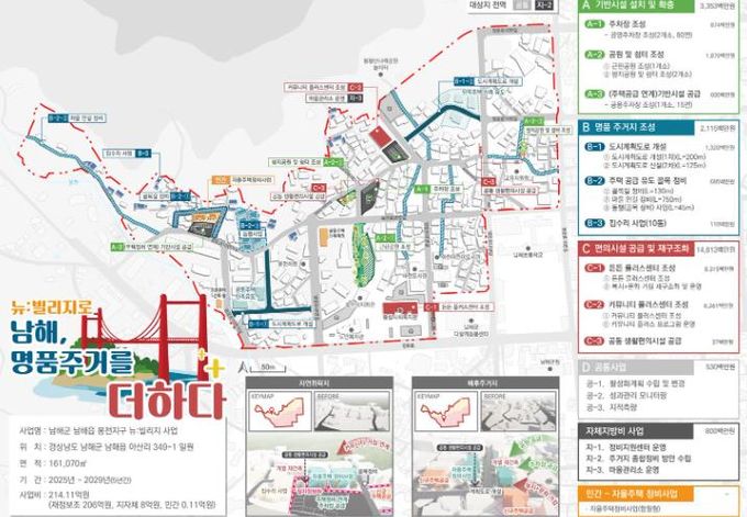‘뉴:빌리지 사업’이 본격화되면 남해군 도시재생 전략계획 지역인 봉전지구에서 △기반시설 설치 및 확충(주차장 조성, 공원 및 쉼터조성, 주택정비연계 기반시설 공급) △명품주거지 조성(도시계획도로 개설, 주택공급 유도 골목정비, 집수리사업), △편의시설 공급 및 재구조화(든든 플러스센터 조성, 커뮤니티 플러스센터 조성, 공동 생활편의시설 공급) 등의 사업이 추진된다.