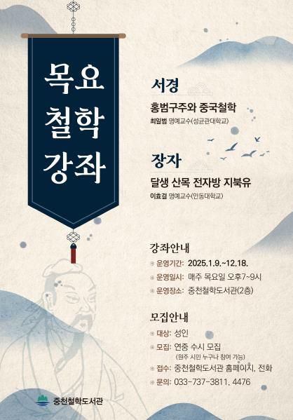 [경남도민뉴스=표재민 기자] 원주시 중천철학도서관은 오는 9일부터 동양 철학의 고전 '서경'과 '장자' 철학 강좌를 운영한다.
