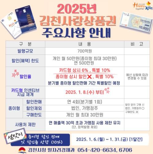 올해 총 700억 원 규모로 발행되는 김천사랑상품권은 카드형의 경우 상시 할인율 6%, 특별할인 10%(분기별 1회)로 운영할 방침이다.
