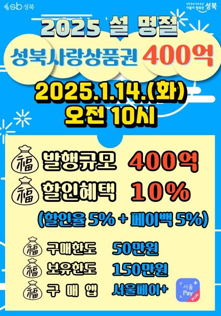 [경남도민뉴스=류종길 기자] 서울 성북구가 2025년 설 명절을 앞두고 400억 규모의 ‘성북사랑상품권’을 발행한다.