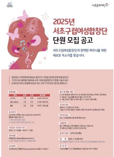 [경남도민뉴스=김완호 기자] 서초구와 서초문화재단은 2025년 새해를 맞아 서초구립여성합창단의 신규단원을 모집한다고 밝혔다.
