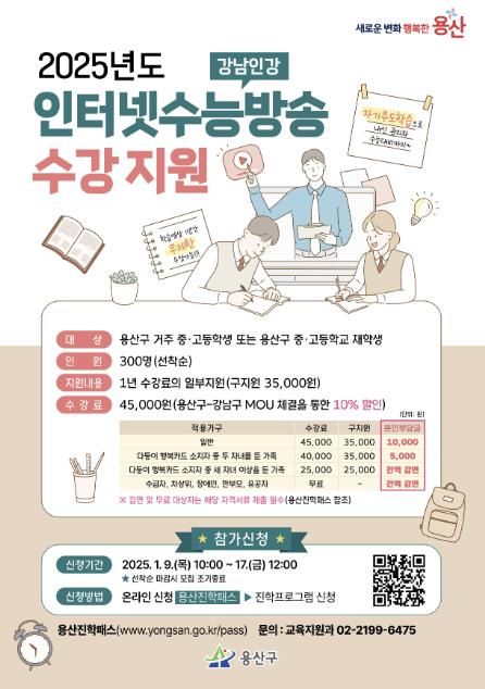 [경남도민뉴스=김완호 기자] 서울 용산구가 오는 9일에서 17일까지 ‘2025년도 인터넷수능방송(강남인강)’ 수강 지원받을 지역 내 거주 또는 재학 중인 중·고등학생, 학교 밖 청소년 등 300명을 선착순 모집한다.