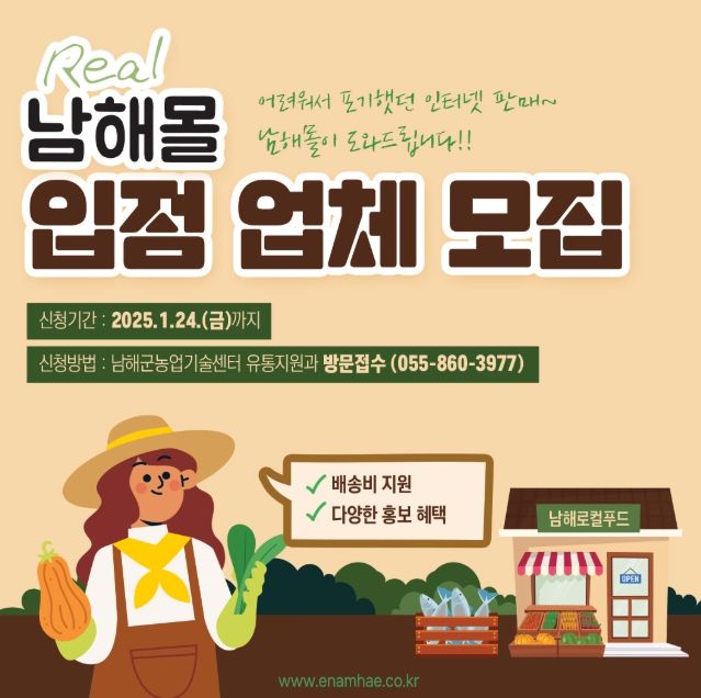 [경남도민뉴스=김부경 기자] 남해군은 2025년 남해몰 상반기 입점 신청자를 모집한다고 밝혔다.