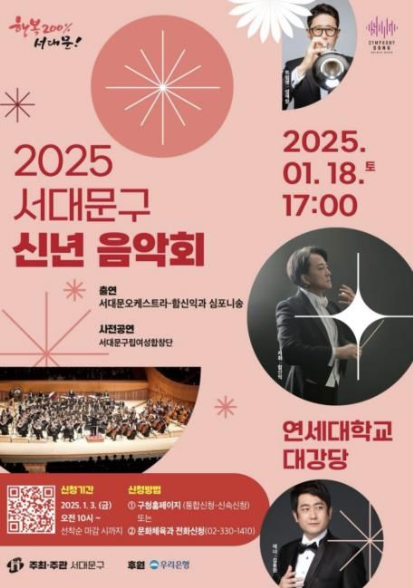 [경남도민뉴스=김완호 기자] 새해를 맞아 서대문구가 이달 18일 토요일 오후 5시 신촌동 연세대학교 대강당에서 ‘구민과 함께하는 2025 서대문구 신년 음악회’를 개최한다.