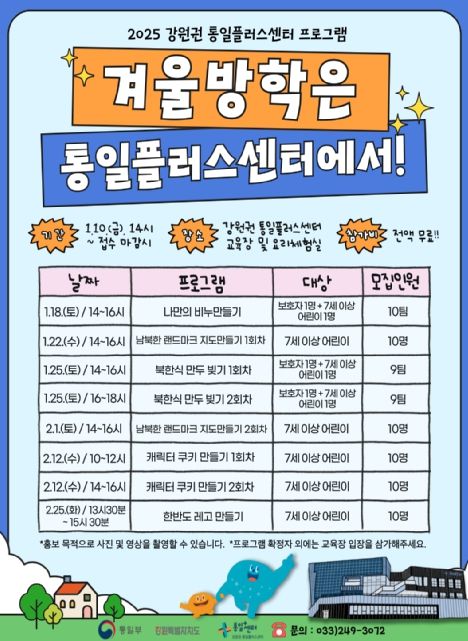 이명권 통일플러스센터장은 “이번 겨울방학 프로그램은 아이들이 남북한의 문화와 역사를 쉽고 재미있게 배울 수 있는 기회”라며, “많은 아이들이 가족과 함께 참여해 통일에 대해 긍정적이고 창의적인 경험을 쌓길 바란다”고 말했다. 이어 “강원권 통일플러스센터는 앞으로도 다양한 프로그램을 통해 지역 주민들이 일상 속에서 교류하고 소통할 수 있는 거점 공간이 되도록 노력하겠다”고 덧붙였다.