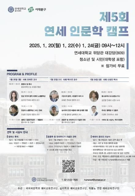 [경남도민뉴스=김완호 기자] 서대문구가 연세대학교 문과대학과 공동으로 이달 20일과 22일, 24일 오전 9시부터 정오까지 연세대 위당관 대강당(B09호)과 캠퍼스 일대에서 ‘연세 인문학 캠프’를 개최한다. 이 행사는 2023년 1월 시작돼 이번에 5회를 맞았다.