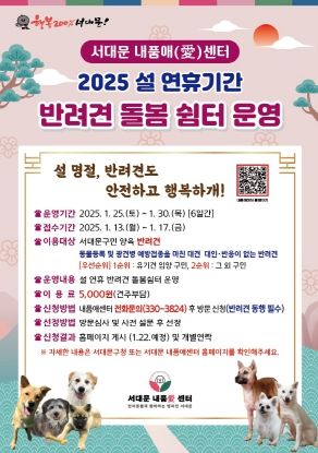 [경남도민뉴스=김완호 기자] 서대문구가 주말과 설 연휴가 이어지는 이달 25일부터 30일까지 ‘서대문 내품애(愛)센터’(모래내로 333)에서 ‘반려견 돌봄 쉼터’를 운영한다.