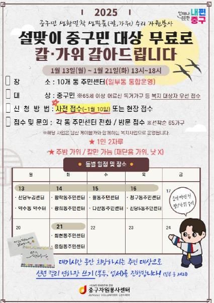 [경남도민뉴스=김완호 기자] 서울 중구는 설 명절을 맞아 중구자원봉사센터에서 주민들에게 무료로 '찾아가는 칼갈이 서비스'를 제공한다고 밝혔다.
