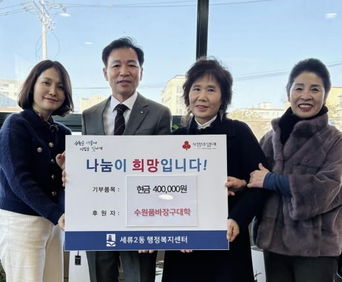 [경남도민뉴스=김미순 기자] 수원품바장구대학은 지난 10일 설명절을 앞두고 이웃돕기 성금 40만원을 권선구 세류2동 행정복지센터에 전달했다.