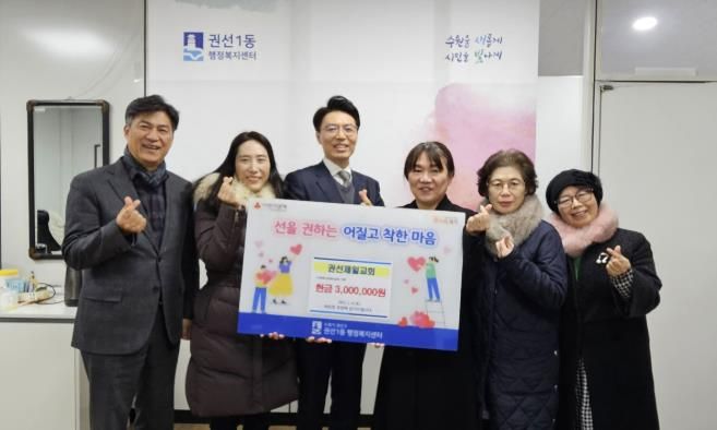 권선제일교회는 작년 연말 성탄절을 맞이하여 이웃사랑을 실천하고자 성도들이 십시일반 성금을 모았으며, 해당 모금을 통해 마련된 성금 300만원을 권선1동에 기탁했다.