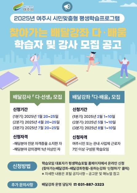 [경남도민뉴스=김미순 기자] 여주시 평생교육과에서는 평생학습 사각지대 주민의 학습권 기회 보장과 시·공간 제약 없는 시민 맞춤형 평생학습 프로그램을 제공하고자 “찾아가는 배달강좌 '다·배움' 학습자 및 배달강사 '다·선생'” 을 모집한다.