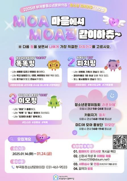 부곡동청소년문화의집 관계자는 “청소년 자치기구는 또래 청소년들과 소통하며 교류할 수 있는 기회를 제공할 뿐 아니라 각 분야의 특성을 살린 특별한 경험을 선사한다”며, “참여를 통해 청소년들이 한층 더 성장할 수 있는 기회를 놓치지 않길 바란다”고 전했다.