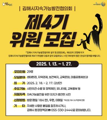 [경남도민뉴스=최미정 기자] 김해시는 오는 27일까지 김해시지속가능발전협의회 제4기 위원을 모집한다고 13일 밝혔다.