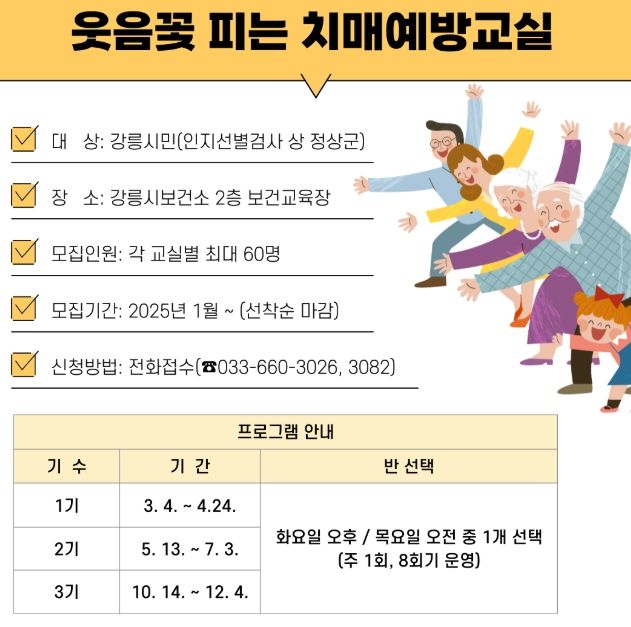 모집 대상은 강릉시에 거주하는 지역 주민 중 치매인지 선별검사 상 정상군이며, 프로그램은 3월부터 12월까지 각 기수별 주 1회, 8회기로 운영된다.