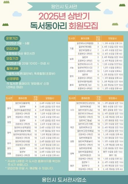 [경남도민뉴스=김미순 기자] 용인특례시는 20일부터 17곳의 지역 공공도서관에서 독서동아리 활동에 참여할 회원 423명을 선착순 모집한다고 14일 밝혔다.