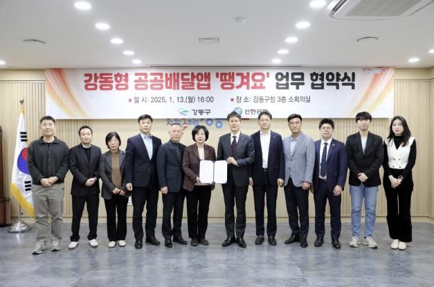 [경남도민뉴스=김완호 기자] 강동구는 소상공인의 경영 부담을 완화하고 지역 경제를 활성화하기 위해 지난 13일 신한은행과 공공배달앱 ‘땡겨요’ 운영을 위한 업무협약을 체결했다고 밝혔다.