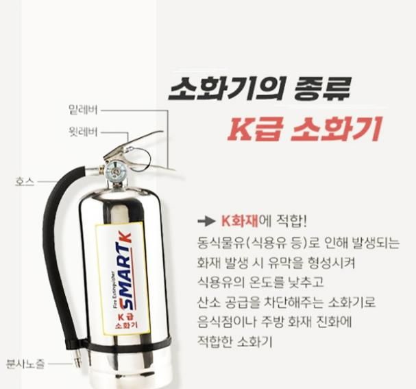 K급 소화기는 동식물유(식용유)로 인한 화재 발생 시 기름막을 형성시켜 식용유의 온도를 낮추고 산소 공급을 차단해 음식점이나 주방에서 발생하는 화재에 적합한 소화기이다.