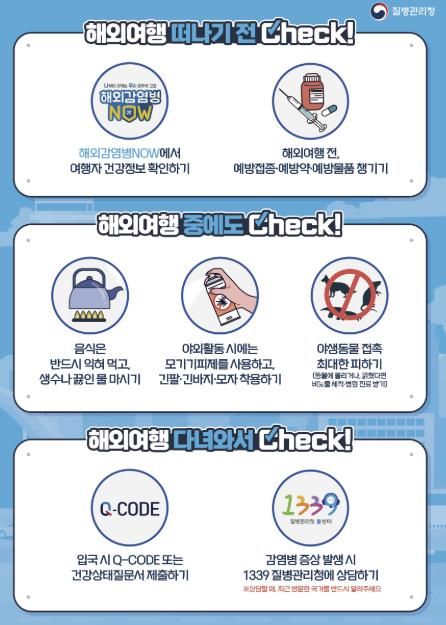▲(여행 전) 질병관리청‘해외감염병 NOW’홈페이지에서 국가별 주의해야 할 감염병 정보와 예방백신이 있는 감염병을 확인하고 예방약과 기피제 및 긴 옷 등을 챙겨야 한다. ▲(여행 중) 야외활동 시에는 모기 기피제를 3~4시간 간격으로 사용하고 긴팔·긴바지·모자 등을 착용하여 모기에게 물리지 않도록 해야 한다. ▲(귀국 시) 큐코드(Q-CODE) 또는 건강 상태 질문서를 제출해 자신의 건강 상태를 정확히 밝히고, 유증상 시 검역관에게 통보하거나 1339 질병관리청과 상담해야 한다.