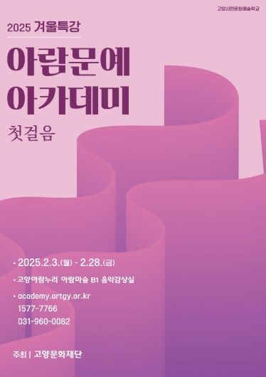 [경남도민뉴스=김미순 기자] 고양문화재단은 고양아람누리 문화예술교육 프로그램 '2025 겨울특강 아람문예아카데미'를 내년 2월 3일부터 2월 28일까지 4주간 진행한다. ‘첫걸음’이라는 주제로 총 9개의 프로그램을 마련해 새해에도 예술인문학을 폭넓게 감상하고 이해하고자 하는 고양시민들의 첫걸음을 응원한다.