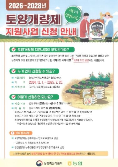 김조향 농업정책과장은 “이번 사업은 토지개량제를 3년을 1주기로 무상 공급하는 사업으로 2026년부터 2028년까지 사업을 한 번에 신청받는 만큼 토양개량제가 필요한 농업인들께서는 빠짐없이 기간 내 접수하시길 바란다”고 말했다.