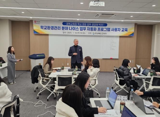 [경남도민뉴스=이돈휘 기자] 경북교육청은 14일 예천군 예천축산농협 한우프라자 2층 소회의실에서 도내 교육지원청 공기질 업무 담당자 22명을 대상으로 ‘나이스 업무 자동화 프로그램’ 사용자 교육을 시행했다.