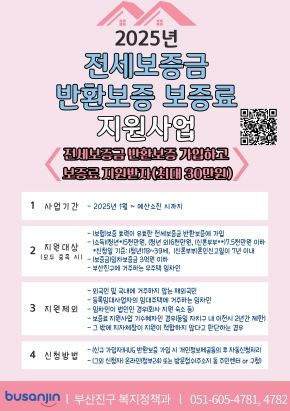 [경남도민뉴스=김채연 기자] 부산 부산진구는 전세보증금 반환보증에 가입한 무주택 임차인에게 보증료 최대 30만 원을 지원한다고 9일 밝혔다.