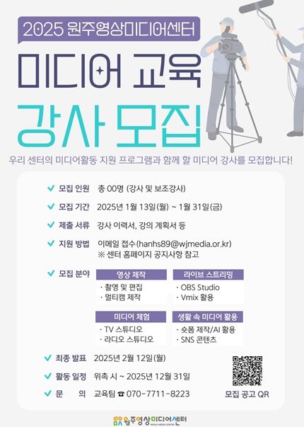 [경남도민뉴스=표재민 기자] 원주영상미디어센터는 오는 1월 31일까지 미디어 교육 강사를 공개 모집한다.