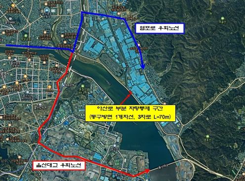 울산시 관계자는 “아산로 동구 방면 교통량을 분산하기 위해 염포로 및 울산대교 방향으로 우회를 안내토록 할 예정이다”라며 “부득이 이곳을 지나야 하는 차량들은 교통 통제에 적극적인 협조를 당부드린다”라고 말했다.