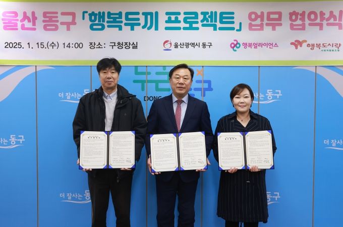 [경남도민뉴스=최재경 기자] 울산 동구는 1월 15일 오후 2시 구청장실에서 ‘행복얼라이언스’, 행복도시락과 함께 결식 우려 아동에게 희망을 전하기 위해 추진하는 ‘행복두끼 프로젝트’ 협약식을 가졌다.
