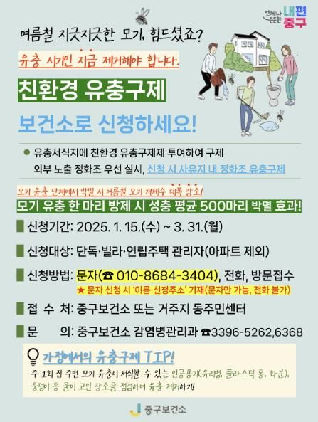 신청 방법은 간단하다. ‘모기 방역 소통폰’으로 이름과 주소를 문자로 전송하거나, 중구보건소와 동 주민센터를 통해 유선 및 방문 신청하면 된다. 신청 기간은 1월 15일부터 3월 31일까지다.