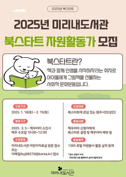 [경남도민뉴스=표재민 기자] 원주시 미리내도서관은 관내 아동들에게 그림책이 담겨있는 책 꾸러미를 선물하는 북스타트 운동을 함께할 자원활동가를 모집한다.