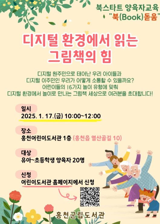 대상은 유아, 초등학생 (예비) 양육자 20명이며, 교육 신청은 1월 16일까지 홍천 어린이도서관 누리집을 통해 할 수 있다.