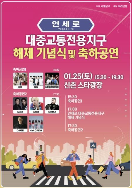 [경남도민뉴스=김완호 기자] 서대문구가 이달 25일 오후 3시 30분부터 7시 30분까지 신촌 스타광장에서 ‘연세로 대중교통전용지구 해제 기념행사’를 개최한다.
