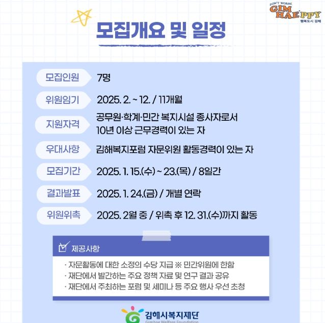 [경남도민뉴스=최미정 기자] (재)김해시복지재단은 오는 23일까지 “2025년 김해복지포럼 자문위원”을 모집한다고 15일 밝혔다.