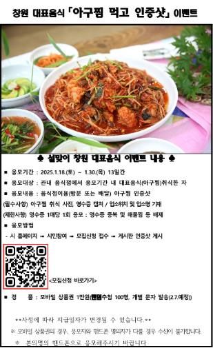 [경남도민뉴스=박민호 기자] 창원특례시는 1월 18일부터 30일까지 13일간 ‘아구찜 먹고 인증샷’ 이벤트를 실시한다.