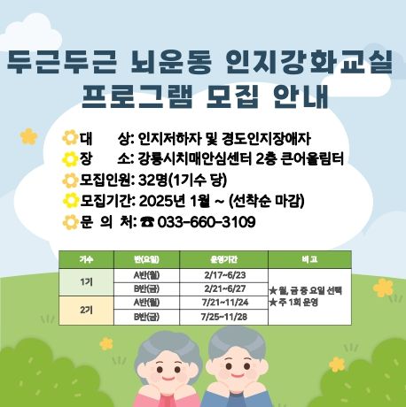 인지강화교실 프로그램과 관련된 자세한 사항은 강릉시 치매안심센터로 문의하면 된다.